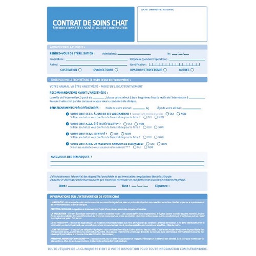 Contrat de soins CHAT (carnet de 50)Développez la médicalisation du chat : Informer le client est une obligation légale, c'est le meilleur moyen d'éviter les désagréments d'explications houleuses ultérieures. Formaliser l'information nécessaire en termes clairs et recueillir le consentement éclairé du client doit être fait sur un support écrit. La signature par le client est indispensable. Carnet de 50 exemplaires. > Fiche produit |